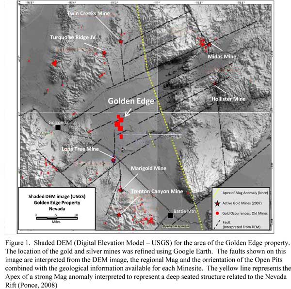 Golden EdgeLocation: Nevada, USA The Golden Edge property is located about 50 km east of the city of Winnemucca in north central Nevada. The property is located about 26 km SSE of Barrick's Turquoise Ridge Mine and 8 km NNE of Newmont’s Lone Tree mine (Figure 1). Exploration has been carried out from 1999 to 2004, and has included seismic, CSAMT, and gravity surveys as well as soil geochemistry. Three RC holes were drilled as recently as 2004 but did not reach target rocks at depth. Golden Edge sits within the Battle Mountain-Eureka trend, a linear zone defined by the presence of gold+silver mines and occurrences in a variety of stratabound and stratiform replacement orebodies that are associated with the Paleozoic Antler Peak limestone. The gold, silver and base metal mineralization in the trend varies from massive sulphides such as at the old Fortitude Mine in the Cortez district, to distal gold dissemination in carbonaceous rocks as at the Marigold deposit. All of the gold and base metals deposits are intimately associated with structures and more importantly, areas of intersecting structures. The Lone Tree gold deposit to the south is associated with a north-south fracture zone called the Valmy fault zone, which is about 90 metres wide and dips 75 degrees to the west. This fault zone continues northward and can be identified by regional magnetics and gravity onto the western portion of the Golden Edge property as announced by the Company in early 2012. CSAMT surveys conducted by Zonge Geoscience, Inc. in 2001-2002 concluded that the depth to pre-Tertiary bedrock is likely to be at its shallowest beneath the eastern end of the survey lines (180-240m), potentially increasing to 450m or more at the western end. Similar results were obtained with a reflection seismic survey consisting of three lines totalling 3.035km. The east-west lines determined the depth to potential host rocks at 240-555m (Figure 2). Three reverse circulation holes (~1,000m total) were drilled in 2002 (HS-1, -2, -3) but never reached the target lithologies. In 2003-2004, however, Placer Dome drilled three vertical reverse circulation holes and hole HP-06 may have encountered the Valmy Quartzite at a depth of 246 meters, with hole HP-09 intersecting Antler Sequence rocks (Edna Mountain formation sandstone & siltstone) at 169 metres (Figure 3). Hole HP-06 also showed a steady increase of gold in water from 2.04 ppt at 54 metres to 89.95 ppt at 251 metres. Only five cuttings samples from these RC holes, taken over five-foot intervals, were assayed with gold values from 9-13 ppb.